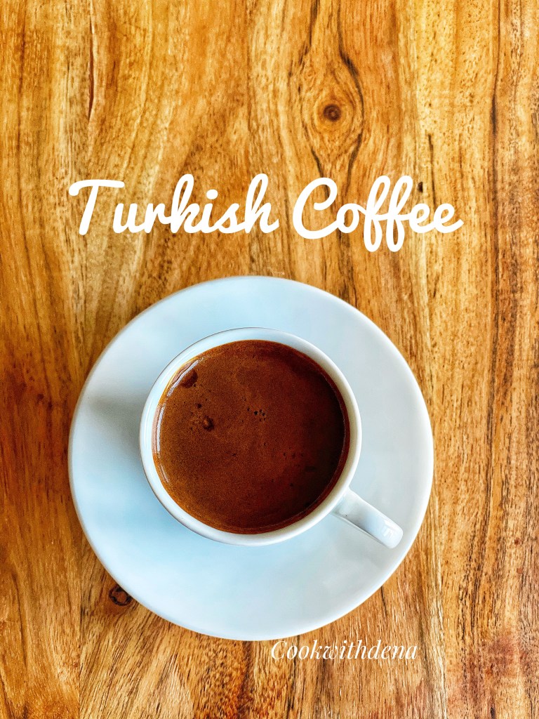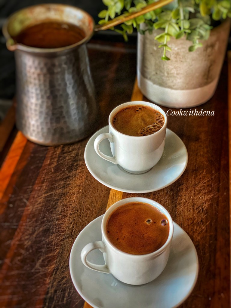 For each Turkish cup of water, you need 1 teaspoon of Turkish coffee and 1/2 teaspoon of sugar.