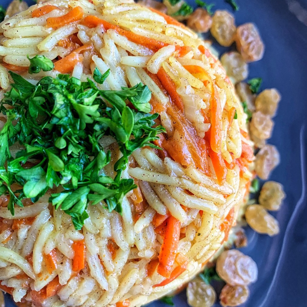 Garnish with golden raisins, chopped parsley and if you like fried almonds.