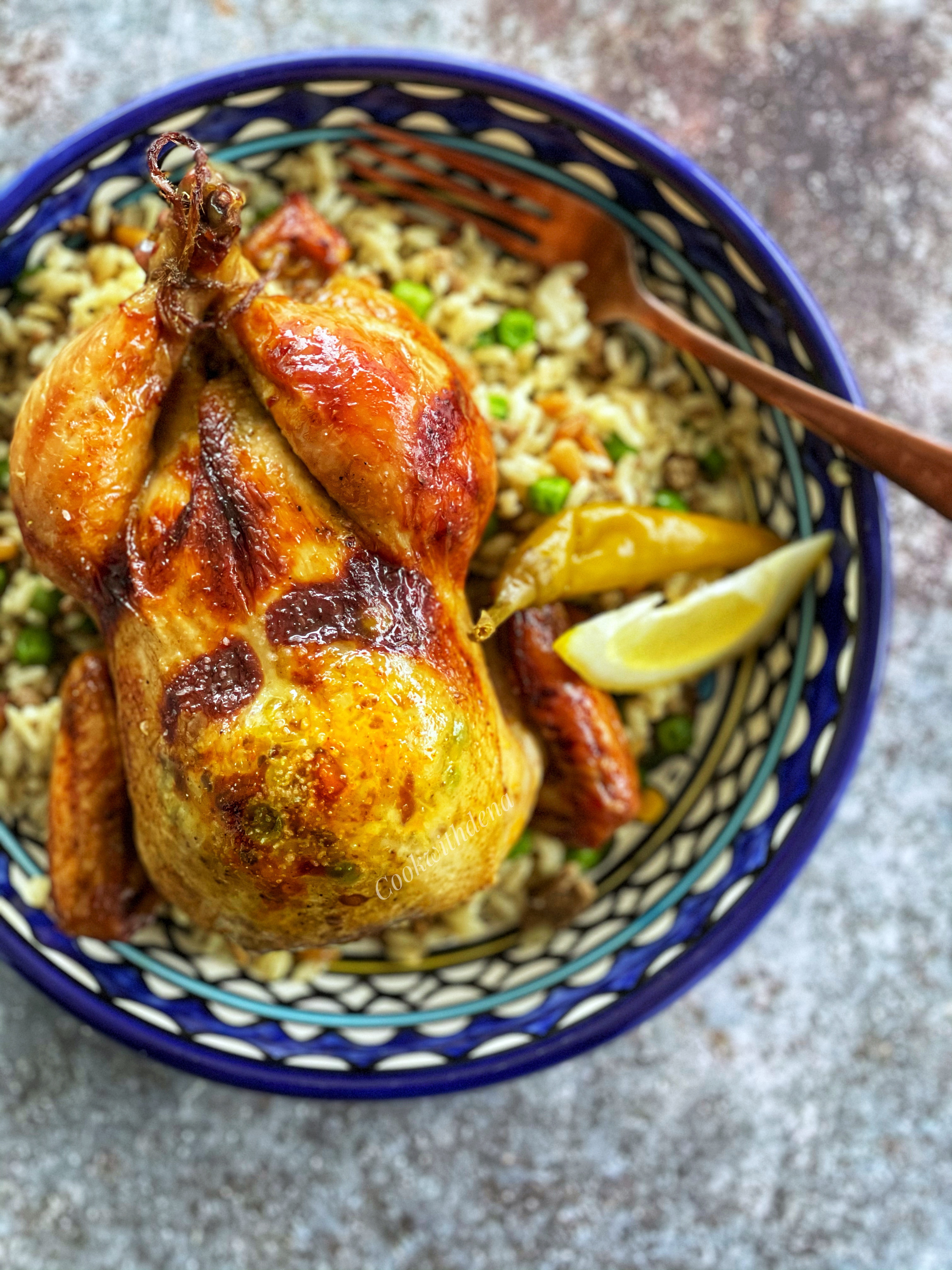 Once the filling is ready, and the Hens have marinated. Fill the Cornish Hens as I showed in the video. This is in bold because I really need you to watch carefully. This is where visual kicks in more than any way of writing it out.