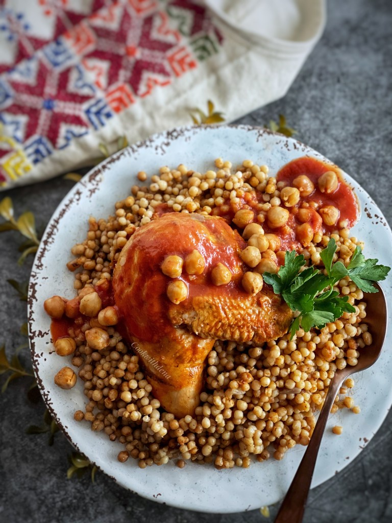 ⁃ In a platter spread the fluffed Maftoul, take out the chicken from the tomato stew and place ontop of the Maftoul.